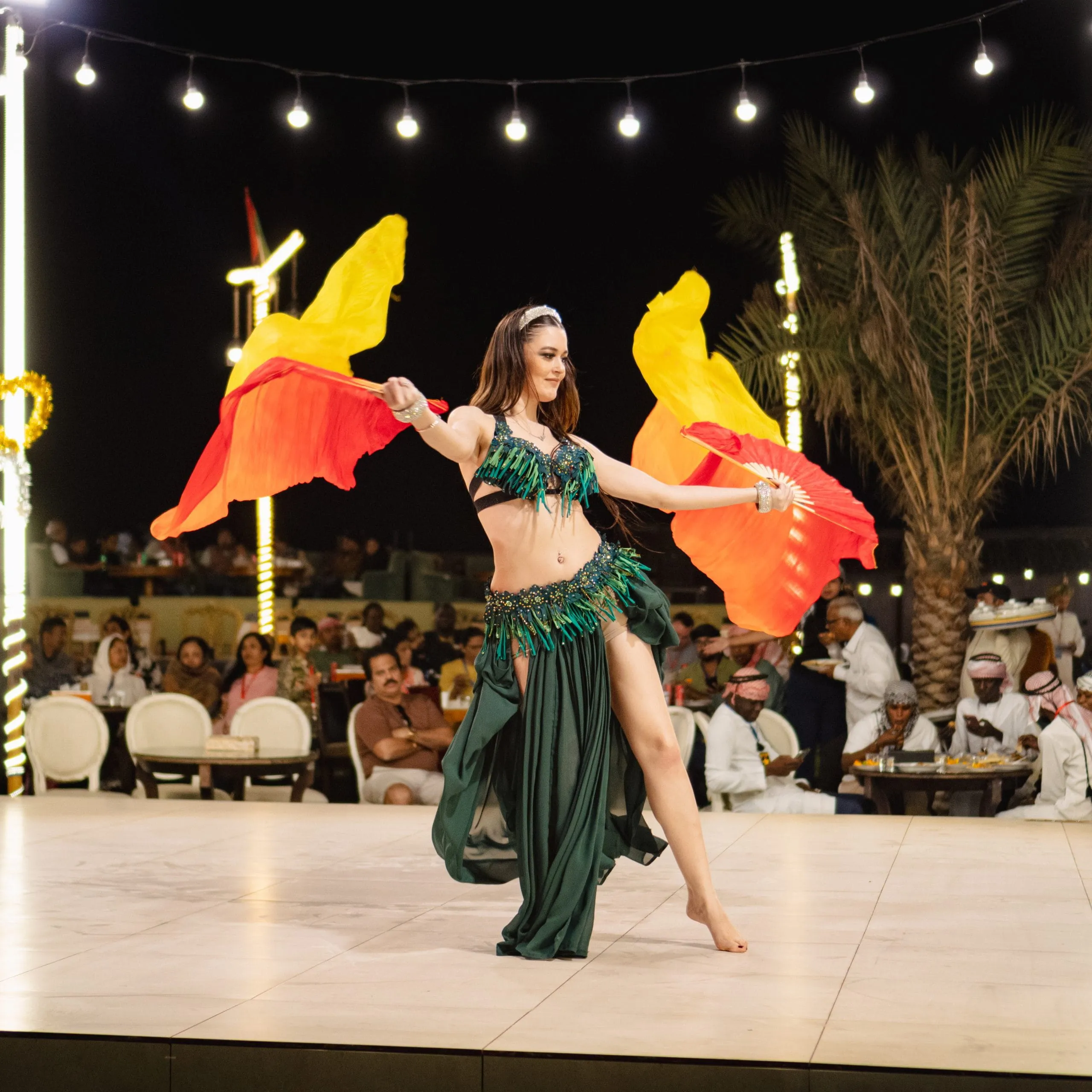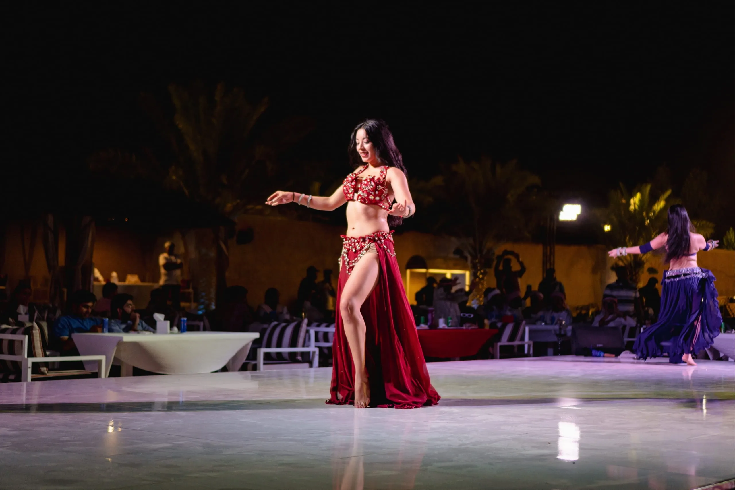 Belly dancing is a mesmerizing Middle Eastern art form featuring graceful movements of hips torso and arms. Talented dancers wear colorful costumes that highlight their elegant moves during 20 to 30 minute performances. Sometimes dancers invite audiences on stage to join the fun. Experience this captivating cultural show during your desert safari where skilled performers showcase the rhythm and energy of Arabian traditions creating unforgettable Live Entertainment under the stars.
