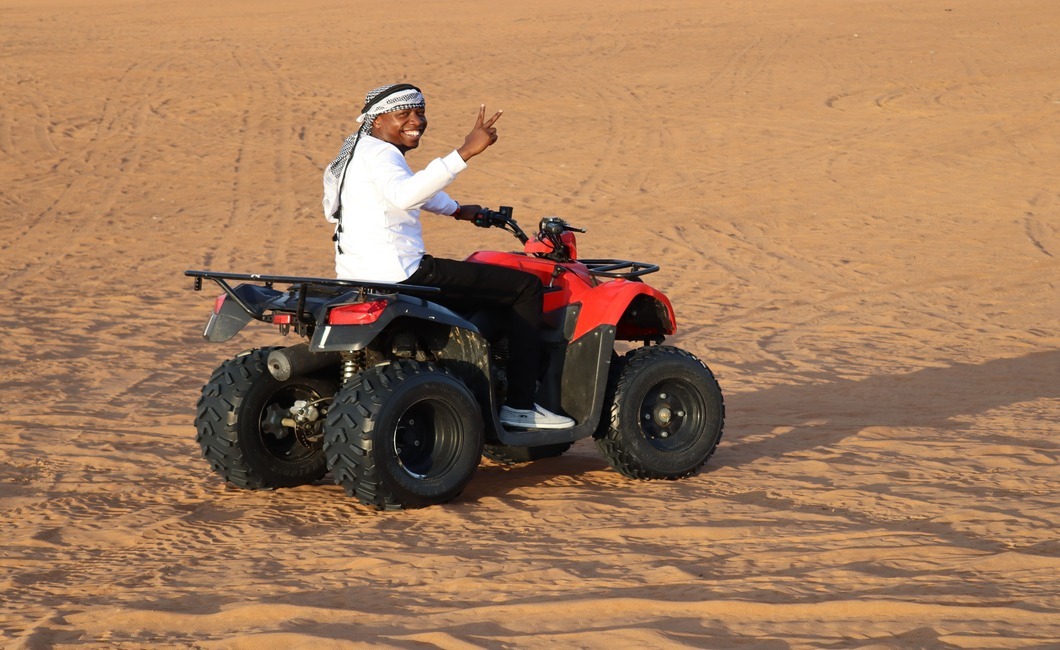 Wear comfortable clothes and closed-toe shoes. Avoid sandals or slippers. Sunglasses and a scarf or face mask are also recommended to protect against the desert dust during the ride.