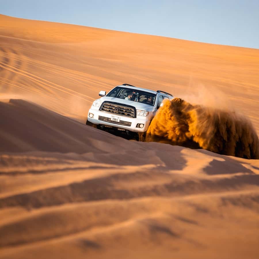 Once at the dunes, buckle up for a wild ride across shifting sands. Our skilled drivers use controlled power and precise turns to deliver roller-coaster-like dune bashing that’s thrilling but safe.